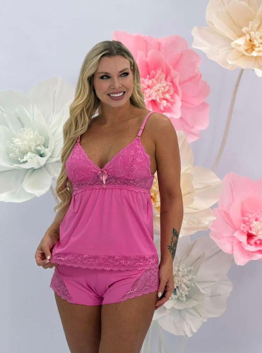 O Baby Doll é confeccionado em microfibra e renda de poliamida com elastano. A blusa mais comprida, com detalhes de renda, alças reguláveis, e regulagem em formato de coração banhado a ouro, oferece um toque de sofisticação. O short mais curtinho, também enriquecido com renda, complementa o conjunto, proporcionando um visual encantador. Composição: 90% Poliamida / 10% Elastano